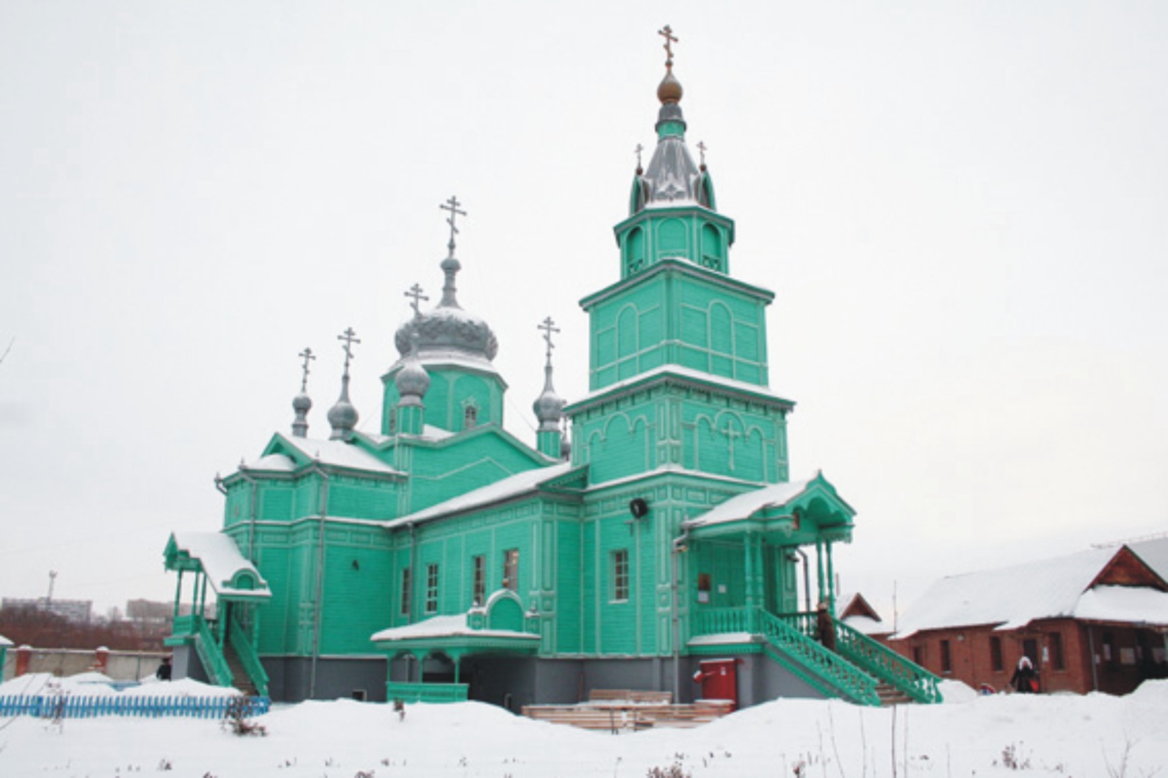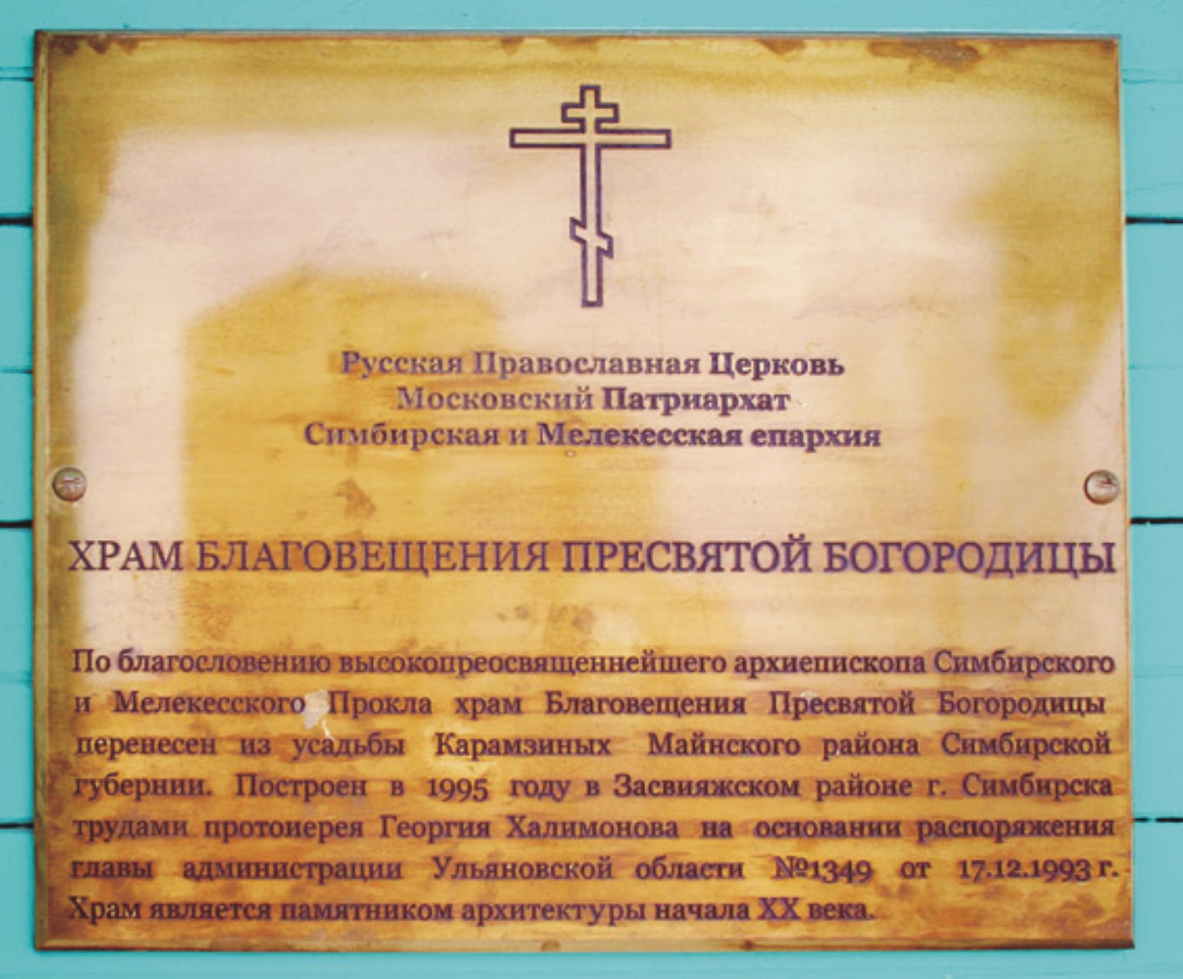 В дальнем Засвияжье Ульяновска, среди лабиринта улиц, застроенных типовыми многоэтажками, рядом с громадой куба из стекла и бетона, где разместился строительный рынок, расцвел островок исторической России. Здесь создан один из самых красивых храмовых комплексов Ульяновской-Мелекесской епархии. Куполов не золотили – церковь, как изумрудный кристалл в оправе черненого серебра, возвышается над снежной белизной. Три высоких крыльца ведут в верхний храм. «Память» у входа повествует, что храм Благовещения Пресвятой Богородицы по благословению архиепископа Прокла трудами протоиерея Георгия Халимонова перенесен в 1995 году из усадьбы Карамзиных Майнского района Симбирской губернии.