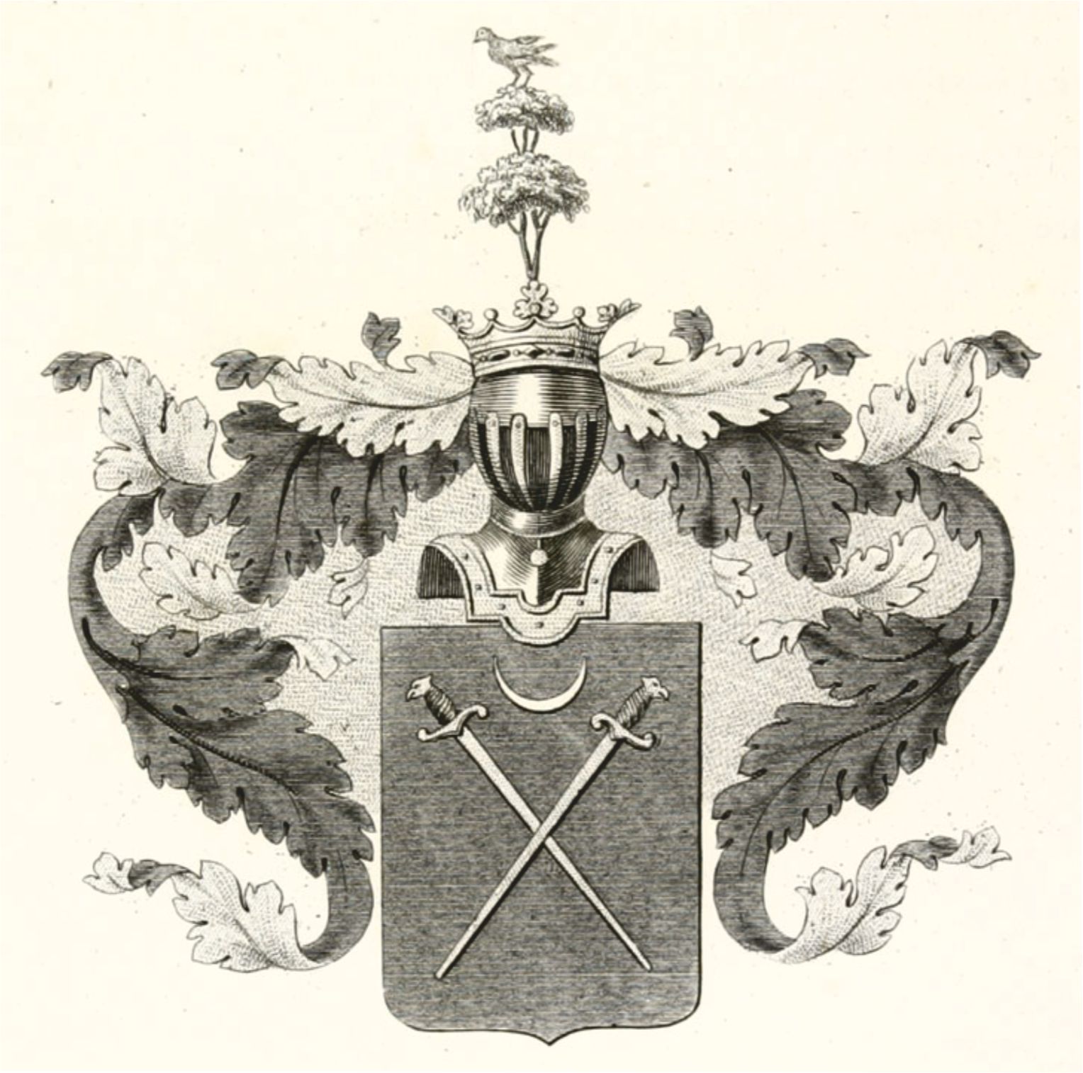 "В щите, имеющем голубое поле, изображена серебряная луна, рогами вверх обращенная, и под нею крестообразно положены два золотые меча остроконечиями вниз. Щит увенчан обыкновенным дворянским шлемом с дворянскою над на нем короною, на поверхности которой поставлено дерево, и на нем находится птица. Намет на щите голубой, подложенный зотом."