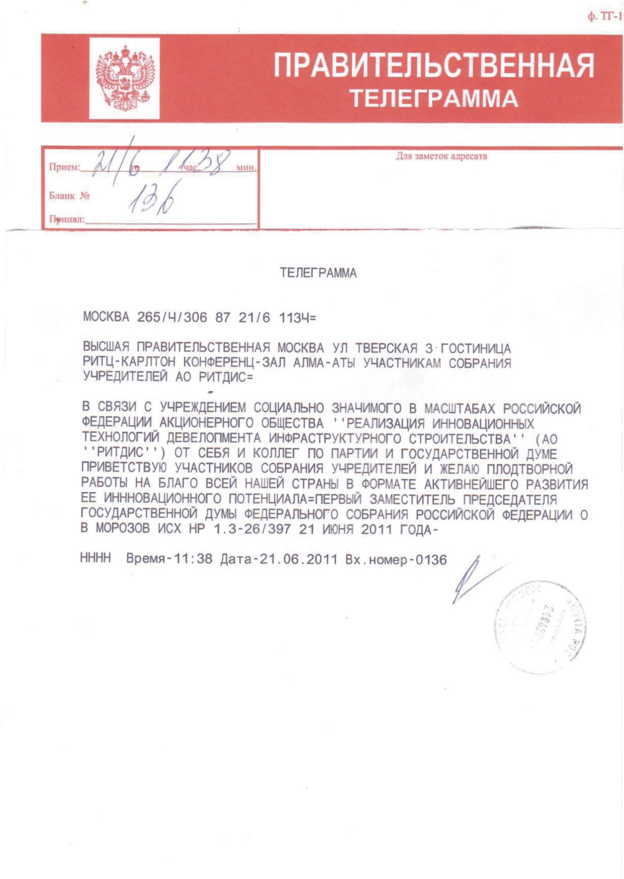 В июне 2011 года я вошел в учредители акционерного общества РИТДИС, целью которого стала реализация инновационных технологий девелопмента инфраструктурного сроительства в России путем предоставления сервисов для реализации инфраструктурных проектов в субъектах Федерации, а также их дальнейшему обслуживанию и совместному управлению в статусе государственно-частных партнерств.